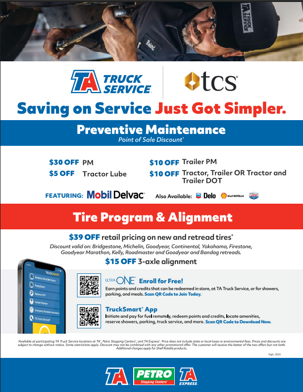 Automatic discounts on tires, service, and maintenance at TA Truck Service centers when you give your DOT Number during payment.